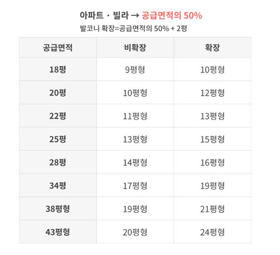 *아파트, 빌라는 공급면적의 50% 발코니 확장한 경우 (+2평)