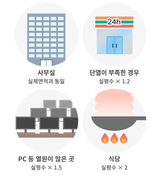 3) PC 등 열원이 특별히 많은 곳은 실평수 x 1.5