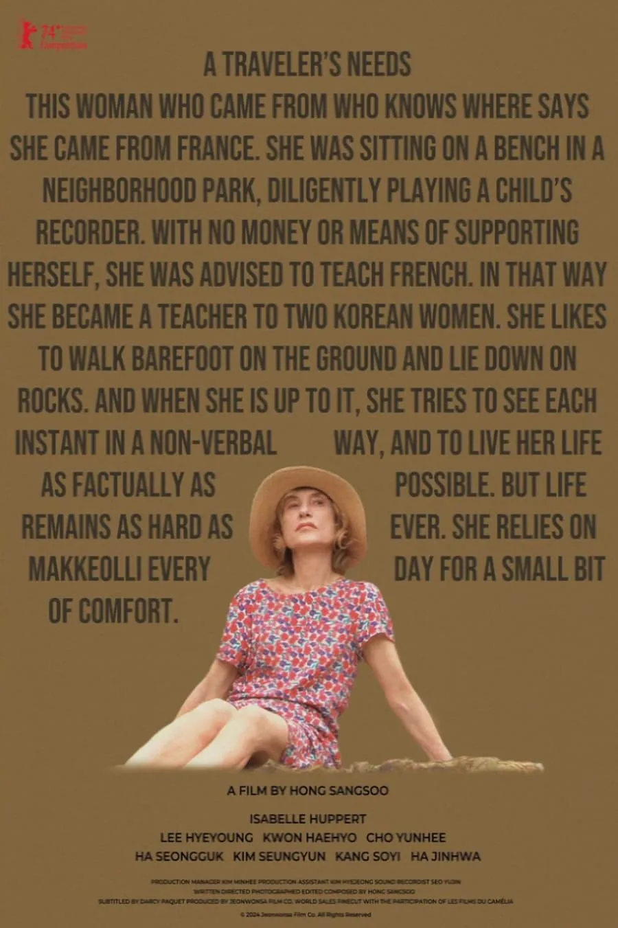 2024년에 개봉 예정인 영화 '여행자의 필요'는 홍상수 감독의 31번째 장편 작품입니다. 이 영화는 프랑스 배우 이자벨 위페르와 홍상수 감독의 세 번째 협업 작품으로, 이자벨 위페르 외에도 권해효, 이혜영, 조윤희, 하성국, 김승윤 등이 출연합니다. 이 영화는 어디서 왔는지 모르는 이 사람이 불란서에서 왔다고 하고, 어린애 피리를 근린공원에서 열심히 불고 있습니다. 돈도 없고 어떻게 살지 몰라해 불어를 가르쳐보라 권했고, 그렇게 두 명의 한국여자들에게 선생이 되었습니다. 이 영화는 제74회 베를린 국제 영화제 공식 경쟁부문 초청작으로 이목이 집중되고 있으며, 은곰상 심사위원대상을 수상한 작품입니다. 이 영화는 홍상수 감독의 섬세한 연출과 이자벨 위페르, 권해효, 이혜영, 조윤희, 하성국, 김승윤 등의 탁월한 연기력이 돋보이는 작품입니다. 이 영화는 사랑에 대한 깊은 이해와 인간의 감정을 섬세하게 그린 작품으로, 관객들에게 감동과 공감을 선사할 것입니다. 이 영화는 2024년 4월 24일에 개봉 예정입니다.
