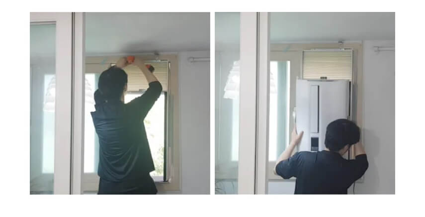 창문 빈 공간을 목재판, 단열재, 박스, 우드락 등을 활용하여 직접 막아줘야 하며 여기저기 발생하는 틈새도 막아줘야 합니다. 또한 창틀 폭이 충분치 않은 경우 안전을 위하여 별도의 거치대 마련이 필요하여 설치가 까다롭습니다. (이동식 에어컨보다 조금 더 어려움)