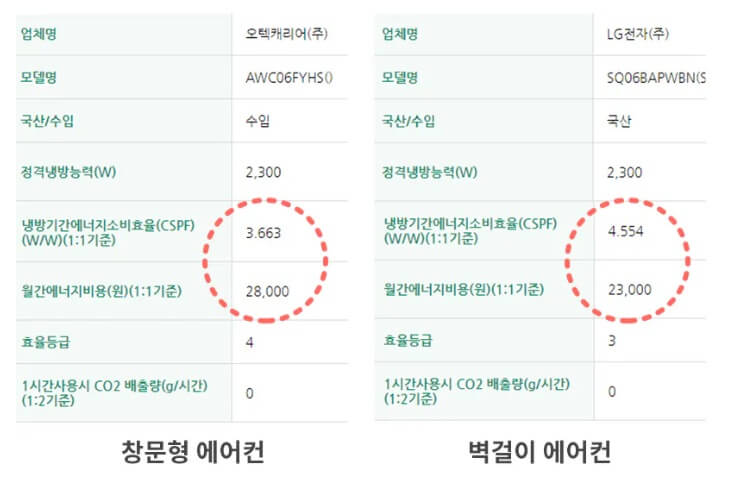 거의 차이가 없지만 1) 냉방면적 차이 2) 직접 설치로 인한 단열 처리 차이에 따라 실제 사용 시 +10~20% 정도의 전기요금 부과 될 수 있습니다.
