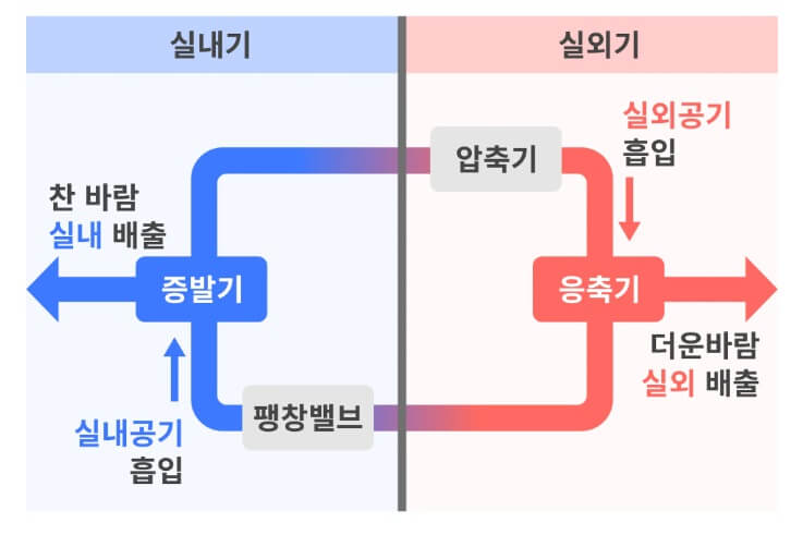 압축→응축(액화)→팽창→증발 반복하여 찬 공기를 실내로 공급